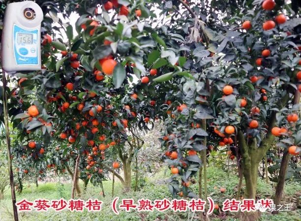 在考察完美国糖桔后,在陈贵虎等人的陪同下,江东老师又来到金葵砂糖桔挂果树前认真观察其结果状、果实性状,品尝果实,陪同的《中国南方果树》杂志社的饶述军主任拿出电子测糖仪测定其糖度,其含糖量在13.2%~15.6%之间,非常高,且风味好。江东老师说:“金葵砂糖桔是一个很好的品种,留树时间长,耐贮运性好,不易浮皮,风味非常好,还可以在柑桔北缘地区种植,其适应范围比普通砂糖桔广,还克服了普通砂糖桔留树时间短的缺点,很有发展空间。而且这个品种成熟期在金秋砂糖桔之后、普通砂糖桔之前成熟,市场空间非常大!”